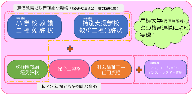・星槎大学(通信制課程)で通信教育を受講することで取得可能です。(※取得する資格により、2~4年間の期間がかかる場合があります。) ・本学で「幼稚園教諭二種免許状」の取得が条件となります。 ・別途費用がかかりますが、通常の費用(科目等履修生)より2割以上安くなっています。