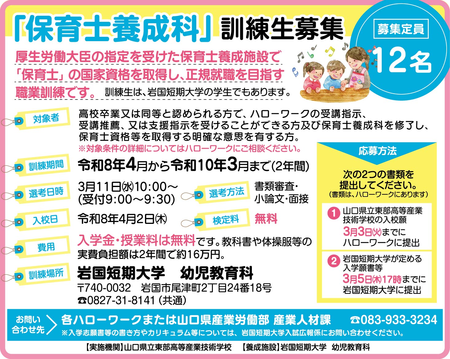 厚生労働大臣の指定を受けた保育士養成施設で「保育士」(国家資格)の資格取得をめざす職業訓練です。訓練生は岩国短期大学の学生でもあります。